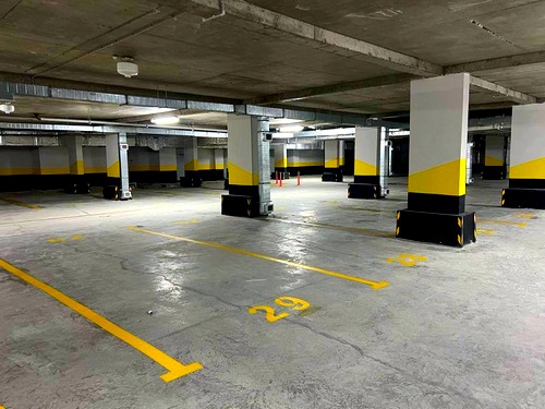 Такая разметка выполняется механически, с помощью специальной негабаритной техники. Позволяет выполнять большие объемы работы в сжатые сроки (парковки, складские помещения, внутренние территории и т.д.).